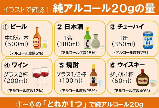 厚生労働省の指針では、1日のアルコール摂取量の目安を、純アルコール量で20g程度としいます。